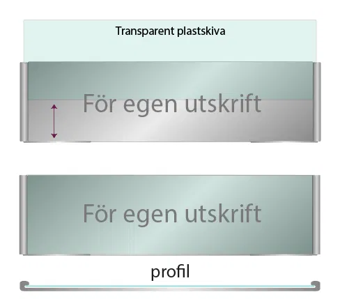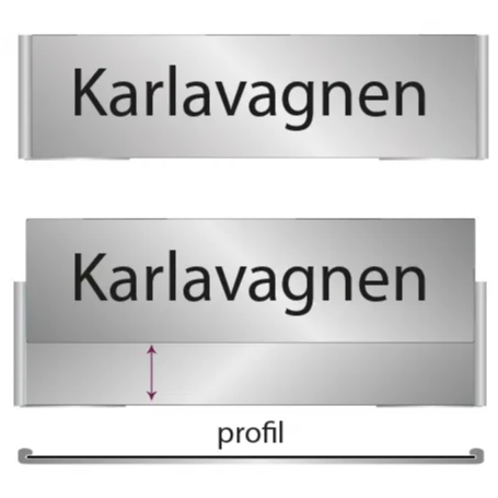 Aluminiumskylt med plastskiva på framsidan. Lätt att byta till olika namn. Finns i två olika storlekar,